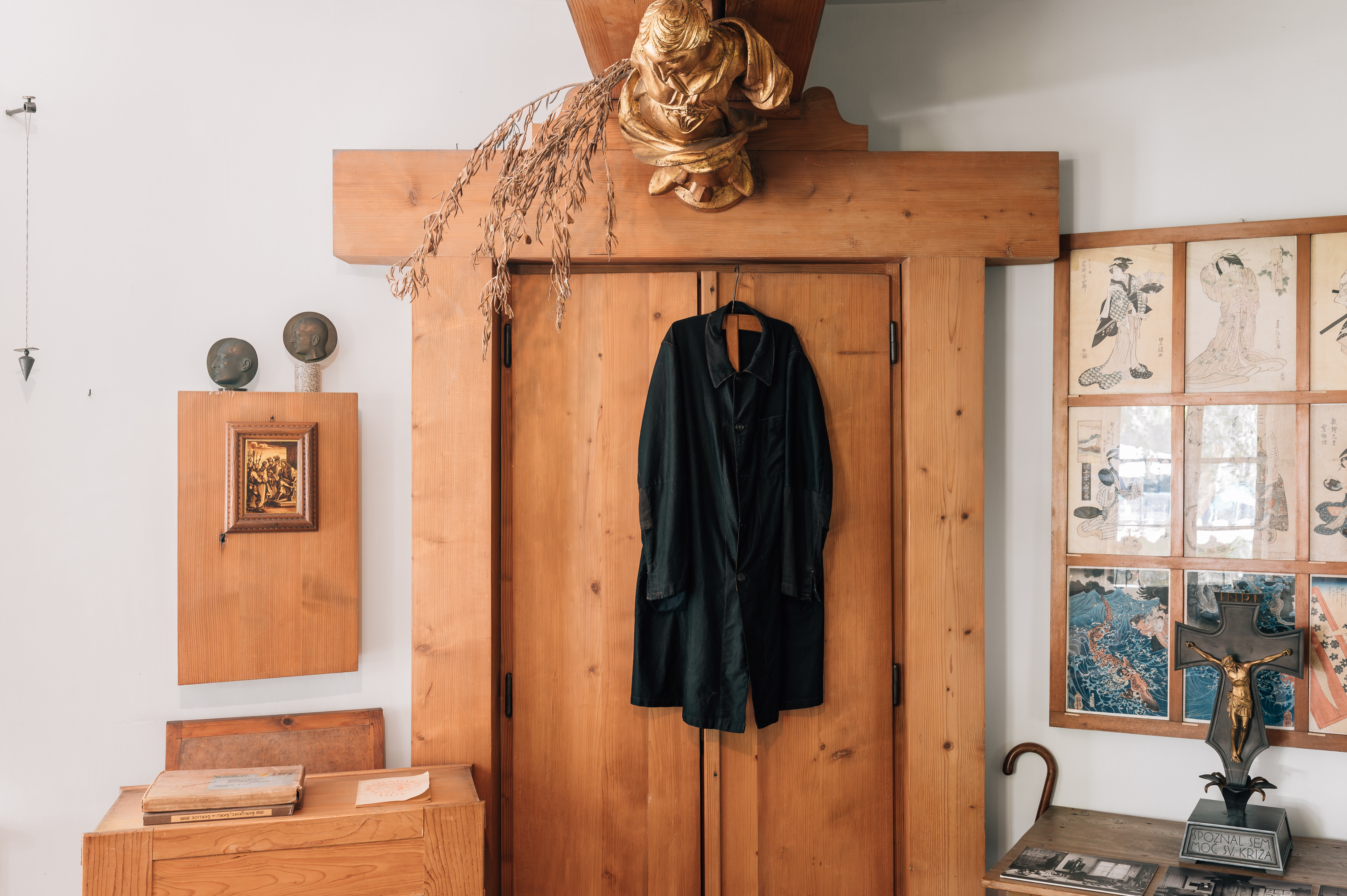 This multilayered exhibition project combines a sound intervention in the heart of Plečnik's home — the architect's bedroom and study — with an exhibition that offers an architectural, photographic, and poetic reflection on memory and how it becomes architecture, creation, even resistance. The exhibition begins with the artist's text entitled Majhen plašč besed (A Small Coat of Words) – the title was inspired by the poetry of Srečko Kosovel, which Bonillas first encountered on a trip when he also discovered Plečnik almost a decade ago. The text, which is not just a collection of data but an architecture of the vanished, where the boundary between truth and imagination is fragile, blurred, and alive, is recorded in Slovenian and English and released on vinyl. It is played in Plečnik's bedroom and study on the ground floor of the house. Twice a day, visitors are able to listen to Bonillas' interpretation of Plečnik's house, which he created from his own memory.