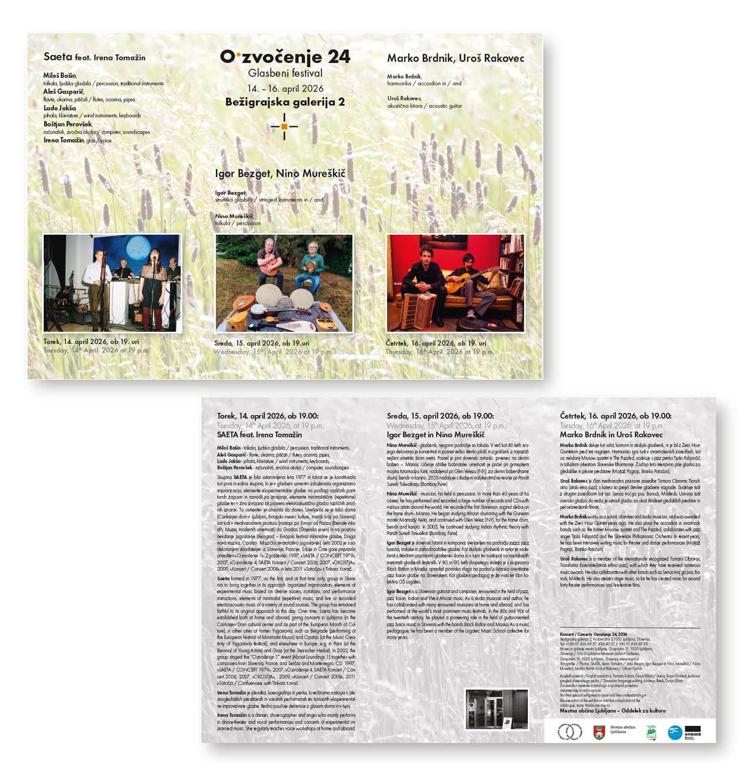 Bežigrajska galerija 2 prireja med 14. in 16. aprilom 2026 tridnevni glasbeni festival O•zvočenje. Na koncertih sodobne glasbe se predstavljajo glasbeni ustvarjalci: SAETA (Miloš Bašin, Aleš Gasparič, Lado Jakša, Boštjan Perovšek, feat. Irena Tomžin), Igor Bezget in Nino Mureškič, Marko Brdnik in Uroš Rakovec.