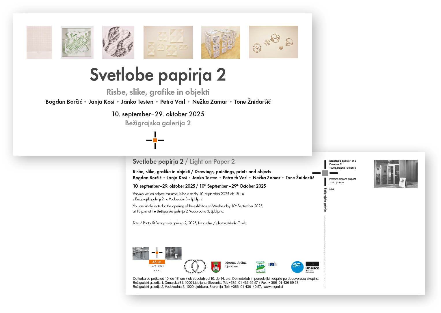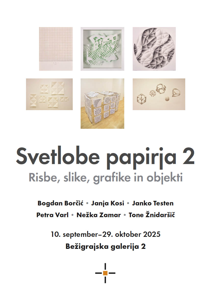 Bogdan Borčić, predstavnik ljubljanske grafične šole, ki je ustvarjal v tradicionalnih grafičnih tehnikah globokega tiska, predstavlja grafične liste v značilni jedkanici in barvi akvatinti. Janja Kosi prepoznana po slikarskih podobah, domiselno umeščenih v izbrani prostor, ustvarjajo s poudarjeno mrežno konstrukcijo videz večplastnosti. Janko Testen je lastni likovni svet zgradil na znanju in težnji po natančno dovršeni izvedbi in predstavlja predmetne in nepredmetne podobe na papirju. Petra Varl v svoji predstavitvi izpostavlja kot glavno izrazno sredstvo specifičnost beline papirja, ki z razgibanostjo objektov ustvarja videz igre svetlobe in sence. Nežka Zamar v konceptualno zasnovani projektni instalaciji, s pomočjo sodobnih medijev in tehnologij, obravnava odnos medprostora z materialom. Tone Žnidaršič z razstavljenim delom iz leta 1968, prikaže način in izvedbo oblikovanja iz papirja, ki ima še danes močan vpliv na generacije ustvarjalcev tovrstnega načina izražanja.