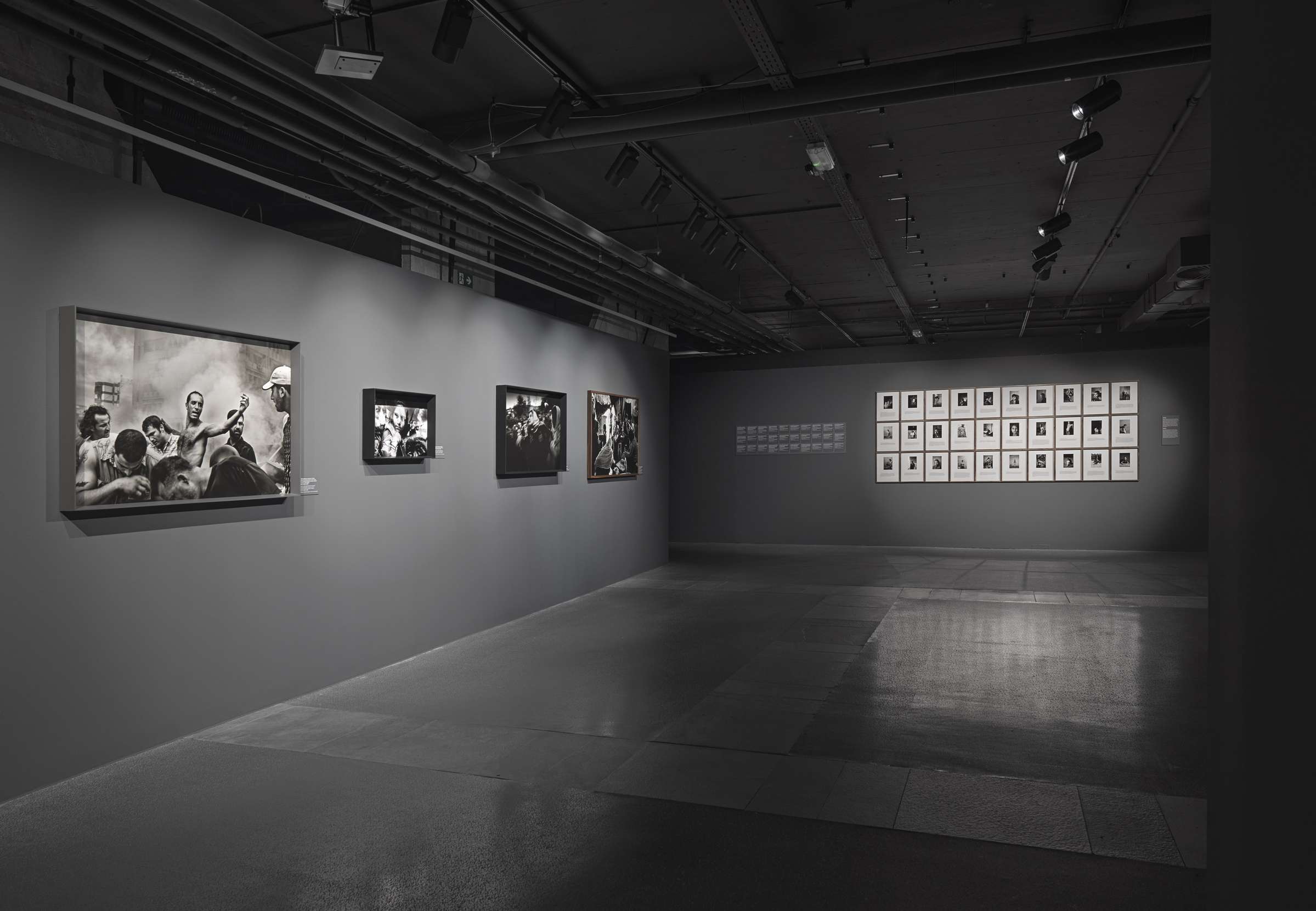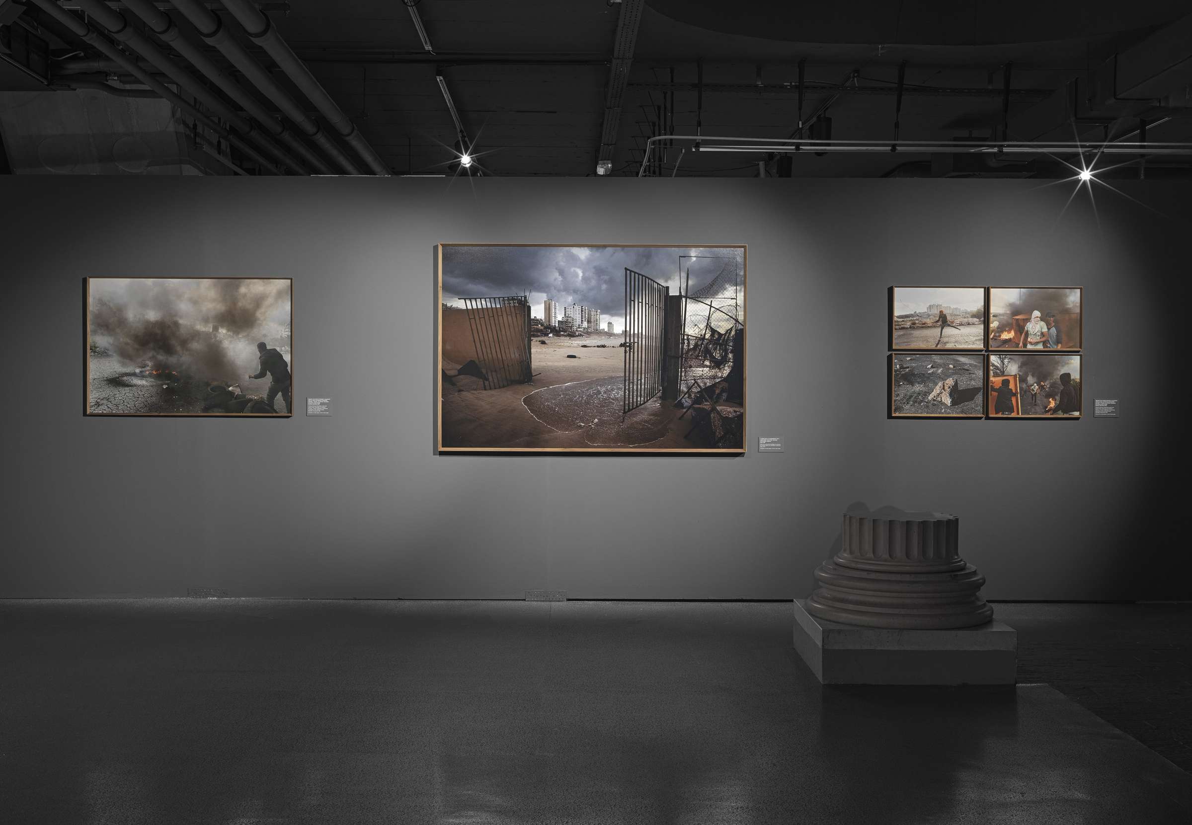 Razstava nas popelje od mest, zaznamovanih z vojno, do okoljskih katastrof, od bežnih trenutkov upanja do tihih posledic razdejanja. Fotografov zgodnji projekt o Albancih, ki so bežali s Kosova (1999), že razkriva njegov občutek za intimnost in ekspresivno formo. Sledijo fotografski cikli s ključnih kriznih žarišč – podobe druge palestinske intifade (2002–2004), ameriško vodene invazije na Irak (2002–2003), Darfurja (2004), cunamija v Indijskem oceanu (2005) in izraelskih zračnih napadov v Libanonu (2006). Pellegrinovo dolgotrajno spremljanje dogajanja v Gazi, od začetkov operacije Cast Lead (2009) do mladih civilistov, na katerih vojna pušča neizbrisljive sledi (2012), ostaja med najmočnejšimi pričevanji sodobnega fotoreporterstva.