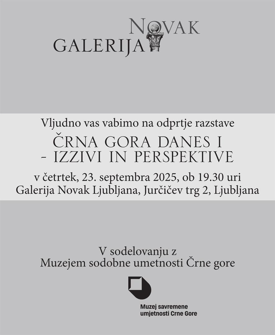 Odprtju v Galeriji Vžigalica bo ob 19.30 v Galeriji Novak Ljubljana v sklopu projekta Muzeja sodobne umetnosti Črne gore z naslovom Črna gora danes sledilo še odprtje razstave Črna gora danes I – Izzivi in perspektive, ki sta jo kurirali Maša Vlaović in Maja Dedić. VABILO