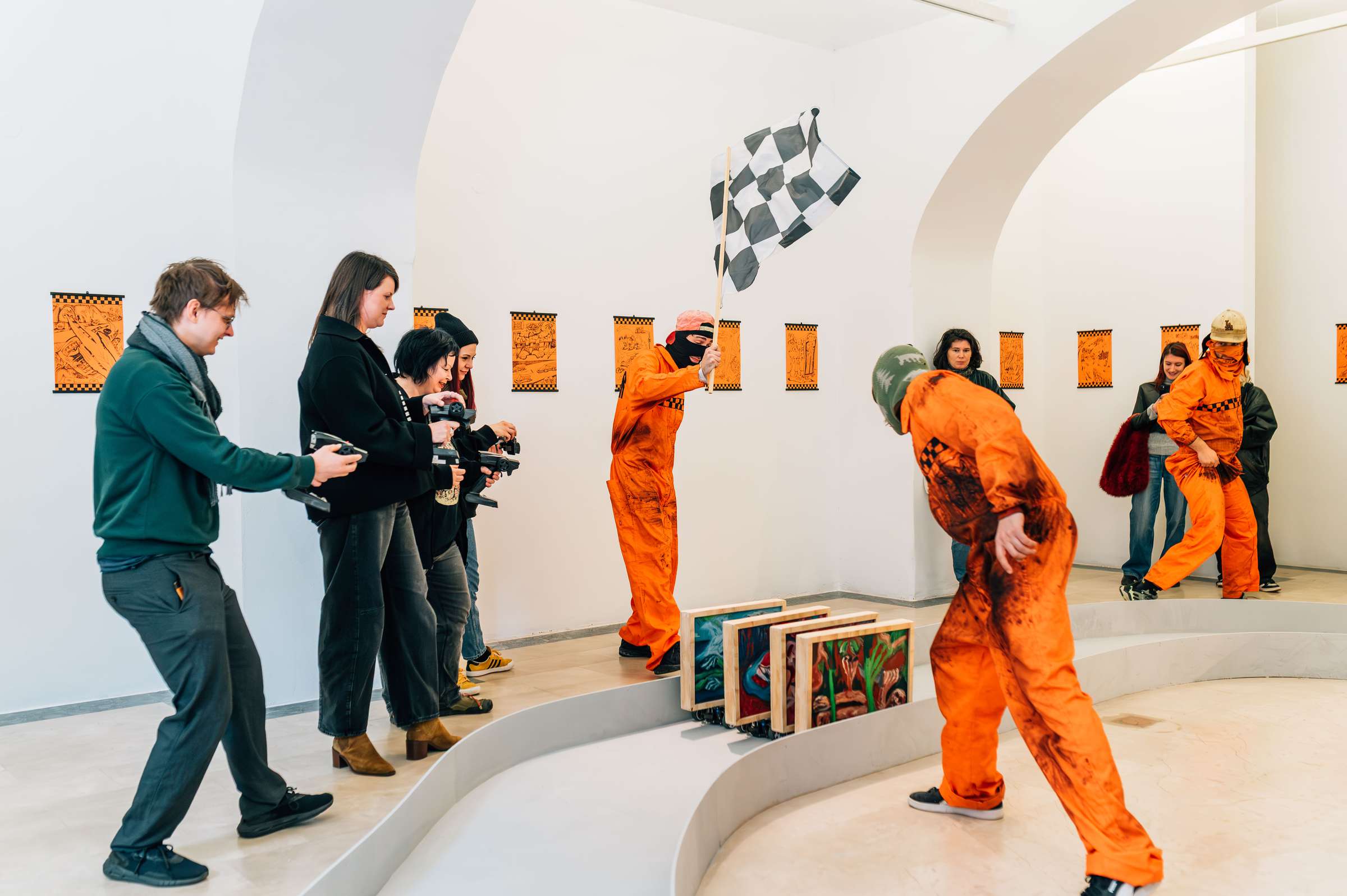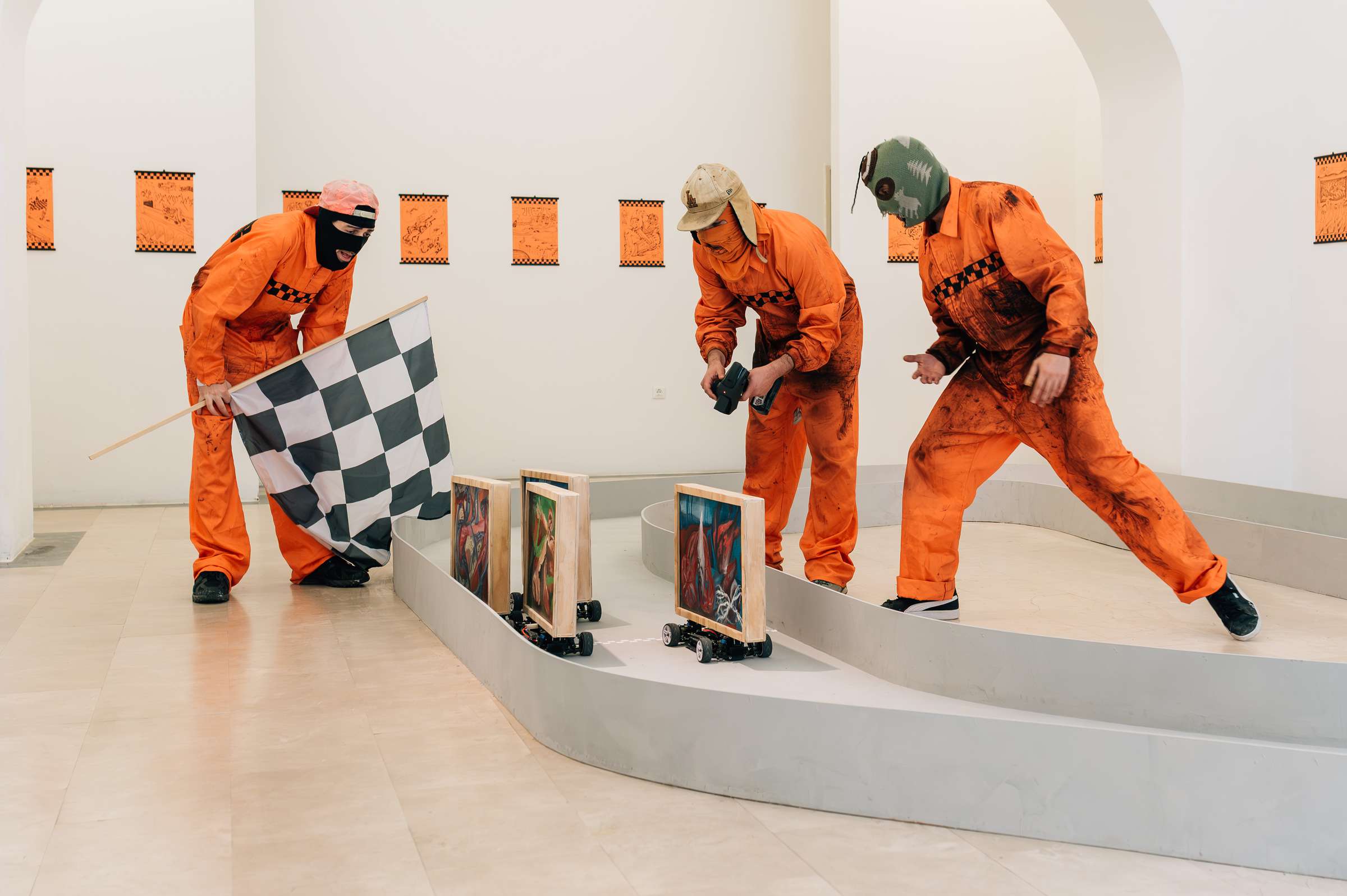 Postavitev v Galeriji Vžigalica tvorijo daljinsko vodene slike različnih slogov in motivov (krajina, postekspresionizem, magični realizem in neoabstrakcija), ki motorizirane brzijo po progi, speljani po celotnem prostoru, kar tvori dinamično, tekmovalno vzdušje in hkrati performativno izkušnjo. Na stenah galerije je razstavljena serija risb, povezanih s svetom avtomobilskih dirk. Obiskovalci so vabljeni k interakciji s slikami na kolesih in k organizaciji improviziranih dirk, samostojnih ali skupinskih. CANEMORTO med svojimi performansi operirajo kot mehaniki v boksih in nadzorujejo dirko.