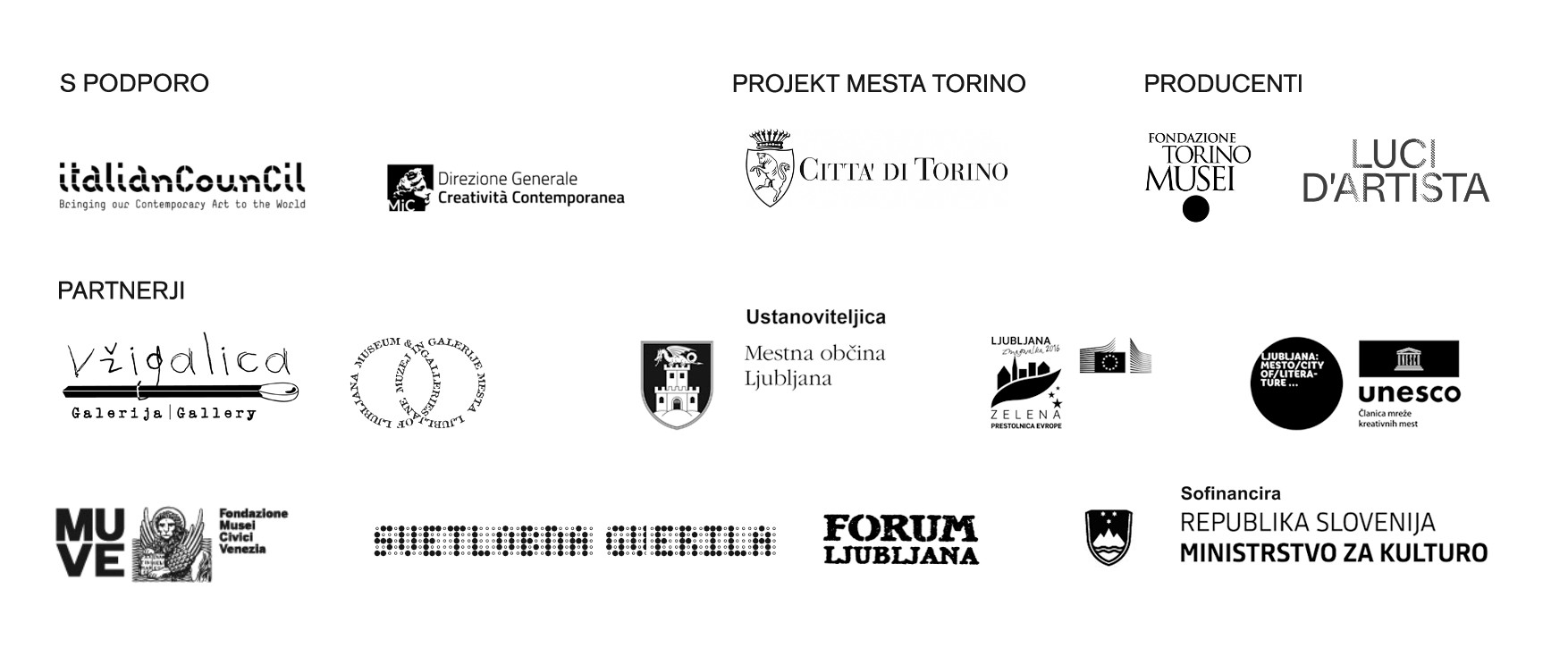 Projekt je nastal zahvaljujoč podpori Direzione Generale Creatività Contemporanea (Generalnega direktorata za sodobno ustvarjalnost) Italijanskega ministrstva za kulturo, v okviru programa Italian Council (14. izdaja, 2025), katerega cilj je mednarodna promocija italijanske sodobne umetnosti. Pri njem sodelujemo s producenti Citta di Torino, Fondazione Torino Musei in Luci d'Artista ter partnerji Fundacijo Musei Civici di Venezia (MUVE), Svetlobno gverilo (Strip Core / Forum Ljubljana), Mestno občino Ljubljana in Ministrstvom za kulturo RS. Ob tem gre posebna zahvala Camilli Sanguinetti in organizaciji Alchemilla.