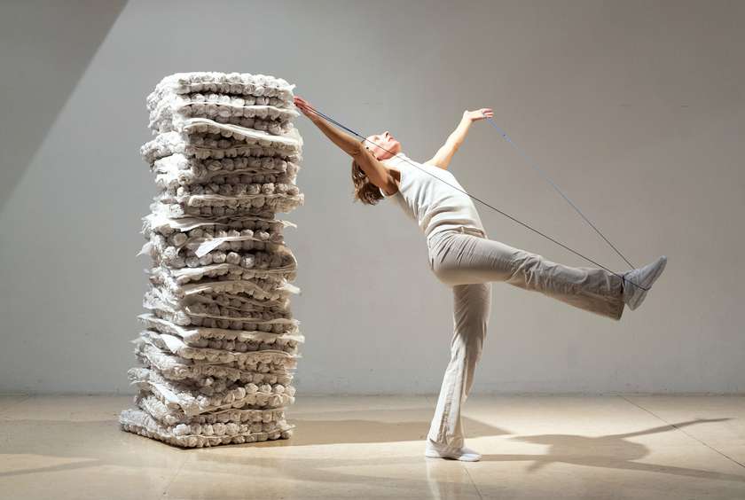 Padajoče telo, v dialogu z gravitacijo upogiba linearno perspektivo, in s svojo konstantno akcijo ustvarja vizualno-kinetično, t. i. ugodje v nelagodju, ki ga pri gledalcu sproži občutek nihanja.