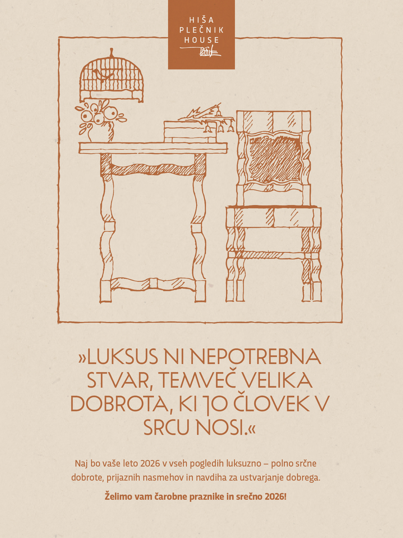 Plečnikova hiša tudi v letu 2026 ostaja ena osrednjih institucij za raziskovanje, interpretacijo in sodobno obravnavo Plečnikove dediščine. Naš prihajajoči program bo povezal aktualne razstave, izdajo več (strokovnih) publikacij in raznolika doživetja za obiskovalce.